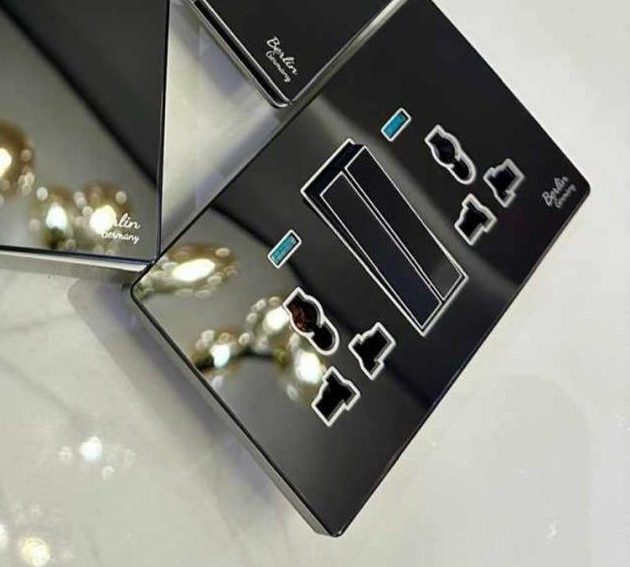Elevate your interior with the sleek sophistication of the Berlin Collection Combination Wall Panel. This premium fixture features a stunning, high-gloss black crystal glass finish that acts as a mirror, reflecting light and adding depth to your walls. Designed for the modern global home, it integrates universal socket outlets compatible with multiple international plug standards alongside switches with crisp blue LED indicators. Finished with the elegant "Berlin Germany" script, this panel is the perfect blend of European luxury and high-tech functionality.