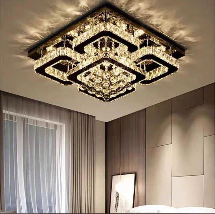 Transform your bedroom or living space into a sanctuary of light and luxury with this stunning Modern Geometric Square Crystal Chandelier. This masterpiece of contemporary design features a bold, multi-tiered square frame that creates a captivating visual depth. Adorned with cascading K9 crystals and intricate crystal blocks, the fixture catches and refracts light to create a dazzling display of sparkles. The warm, golden glow casts beautiful, feathery patterns across the ceiling, adding a romantic and sophisticated ambiance to any room. Perfect for those who love a blend of modern geometry and classic glamour.