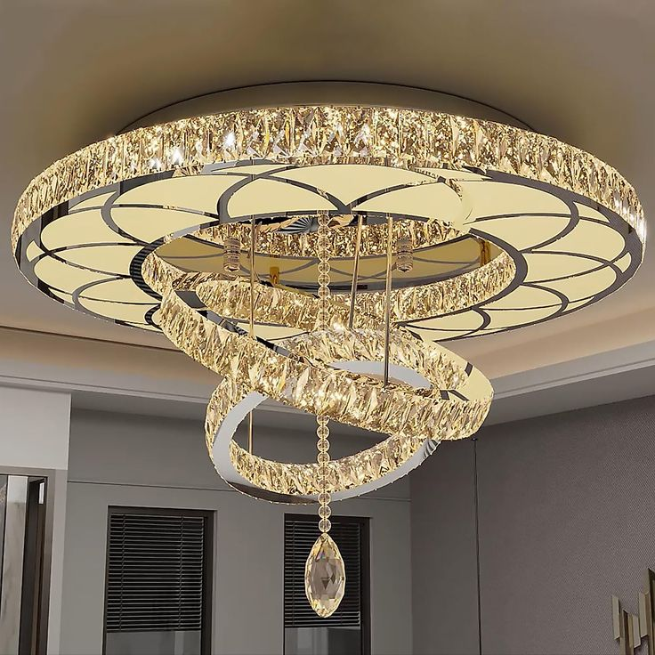 Make a dazzling statement in your home with this exquisite Modern Luxury Spiral Crystal Ceiling Chandelier. This unique fixture masterfully blends the practicality of a flush mount with the drama of a pendant chandelier. The ceiling base features a wide, crystal-encrusted outer ring and a sophisticated geometric shade with interlocking circle patterns that cast a soft, diffused ambient glow. Suspended from the center is a mesmerizing double-helix spiral, densely packed with sparkling crystals that catch the light from every angle. Finished with a graceful teardrop crystal pendant at the bottom, this chandelier brings a touch of high-end glamour and dynamic movement to any contemporary interior.