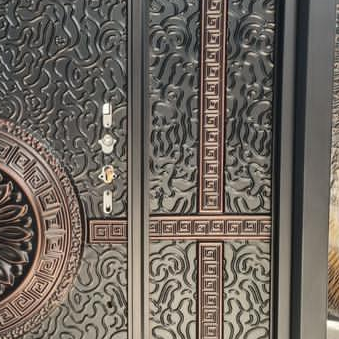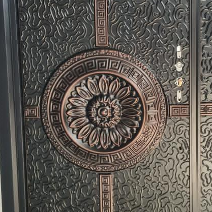 Command attention and ensure ultimate protection with this majestic Luxury Embossed Medallion Steel Door. Designed for grand entrances, this door is a masterpiece of craftsmanship, featuring an intricate, high-relief surface that mimics the look of hand-carved artistry. The deep, dark base color is beautifully contrasted by copper-toned accents that highlight the complex swirling patterns and geometric borders. A striking central floral medallion, framed by a classic "Greek Key" motif, serves as the focal point, adding a touch of classical elegance to a robust security structure. Perfect for villas, luxury apartments, or main gates where style and safety must coexist.