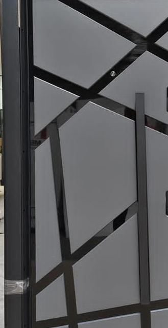 Redefine your entrance with this striking Modern Abstract Geometric Steel Door. Designed for the contemporary home, this door features a bold, asymmetrical pattern that resembles shattered glass or modern art, creating a dynamic visual impact. The sophisticated two-tone color scheme—combining a deep charcoal frame and accents with lighter grey metallic panels—adds depth and elegance. Built for both beauty and protection, this heavy-duty steel door integrates advanced locking mechanisms and sleek hardware, making it the perfect fusion of avant-garde design and high-level security for villas, apartments, and modern residences.