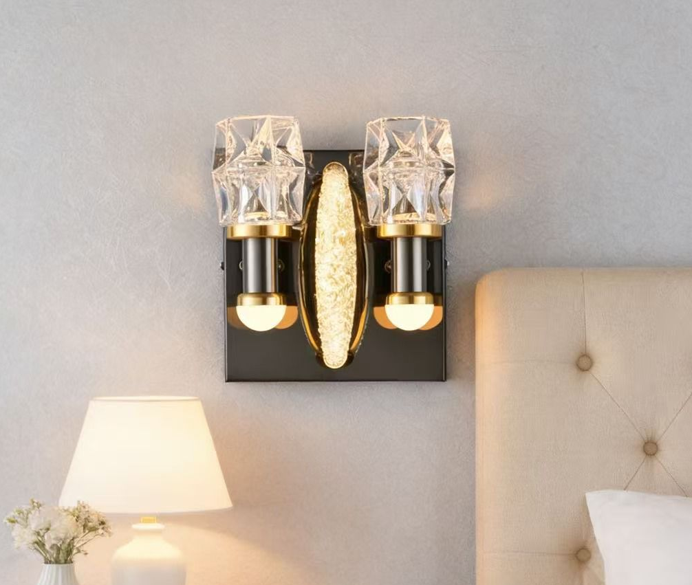 Elevate your interior with this stunning Modern Luxury Wall Sconce. This fixture is designed to be a focal point, featuring a striking combination of materials and textures. The two outer lights are capped with faceted crystal cubes that catch the light and cast dazzling reflections, while the center oval element features a textured, shimmering surface that adds depth and warmth. The contrast between the dark backplate and the bright gold hardware creates a bold, elegant statement. Whether installed beside a bed to replace a bulky table lamp or flanking a bathroom mirror, this sconce brings a touch of hotel-luxury style to your home.