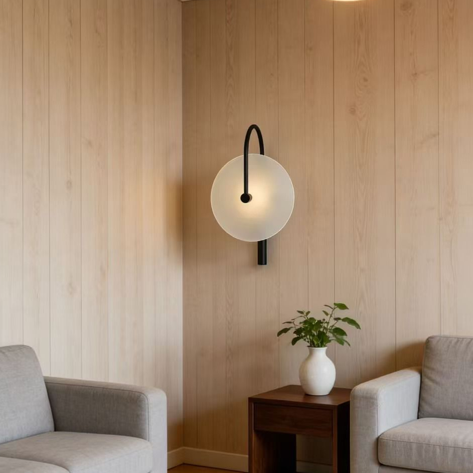 Embrace the beauty of simplicity with this exquisite Modern Minimalist Wall Sconce. This fixture is a masterclass in balance, featuring a large, circular frosted glass shade that appears to float against the wall. Supported by a sleek, matte black curved arm that arches gracefully over the top, the design creates a striking geometric contrast. The milky white glass diffuses the light softly, eliminating harsh shadows and casting a warm, inviting glow that is perfect for relaxation. Ideally suited for Japandi, Scandinavian, or Mid-Century Modern interiors, this sconce adds a touch of artistic elegance to any room.