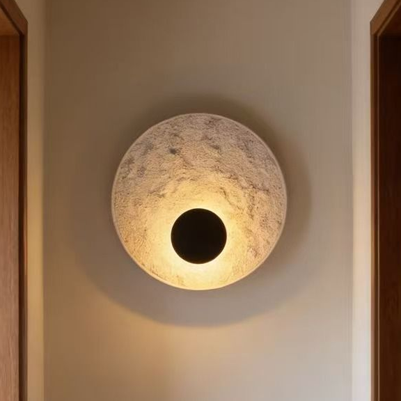 Transform your space into a sanctuary of calm with this Modern Organic Stone-Textured Wall Sconce. Inspired by the natural beauty of the moon and raw earth materials, this fixture features a rugged, tactile surface that contrasts beautifully with smooth walls. The light emanates softly from the textured body, highlighting the intricate details of the finish while the dark central circle adds a bold, modern geometric touch. It is more than just a light; it is a sculptural element that adds depth, warmth, and artistic flair to any room.