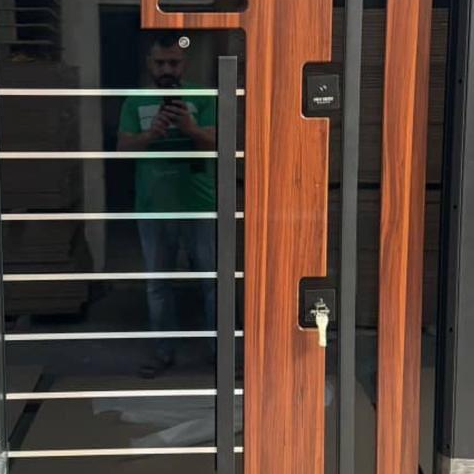 Elevate your home's entrance with this sophisticated Modern Steel Security Door, a perfect blend of natural warmth and industrial sleekness. This door features a striking asymmetrical design that combines high-gloss black panels with rich, teak wood-grain accents. Horizontal stainless steel inlays run across the black section, creating a sense of modern rhythm, while the vertical wood panels feature unique, stylish rounded cutouts that add texture and depth. Built with a heavy-duty steel frame and equipped with a digital smart lock, this door offers the ultimate balance of contemporary artistry and robust security.